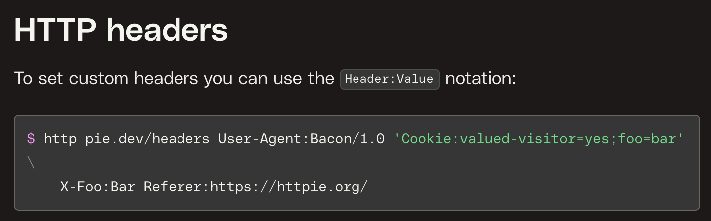 HTTPie docs의 custom header 설정 방식에 대한 설명과 예시만 보았을 때에는, Header:Value를 실제 커맨드 상에 어떻게 배치할 것인가에 대한 고민이 생긴다.